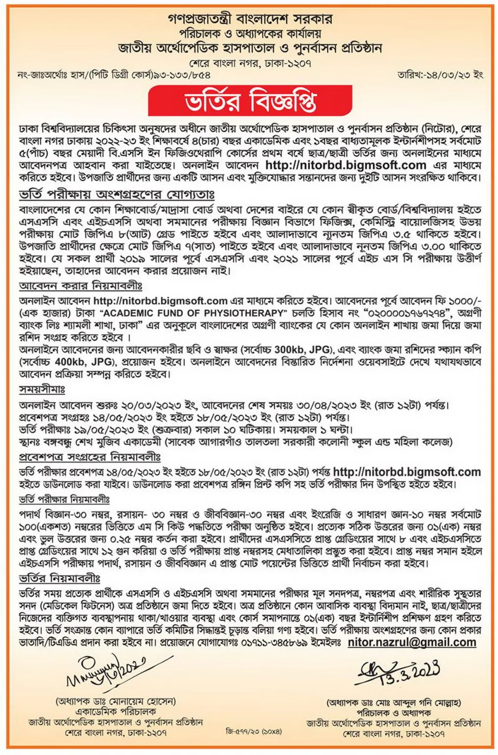 ঢাকা বিশ্ববিদ্যালয়ের চিকিৎসা অনুষদের অধীনে জাতীয় অর্থোপেডিক হাসপাতাল ও পুনর্বাসন প্রতিষ্ঠান (নিটোর), শেরেবাংলা নগর, ঢাকায় ২০২২-২০২৩ ইং শিক্ষাবর্ষে ০৪ বছর একাডেমিক এবং ০১ বছর বাধ্যতামূলক ইন্টার্নশীপসহ সর্বমোট ০৫ বছর মেয়াদি বিএসসি ইন ফিজিওথেরাপি কোর্সের প্রথম বর্ষে ছাত্র/ছাত্রী ভর্তির জন্য অনলাইনের মাধ্যমে আবেদন পত্র প্রকাশিত হয়েছে।