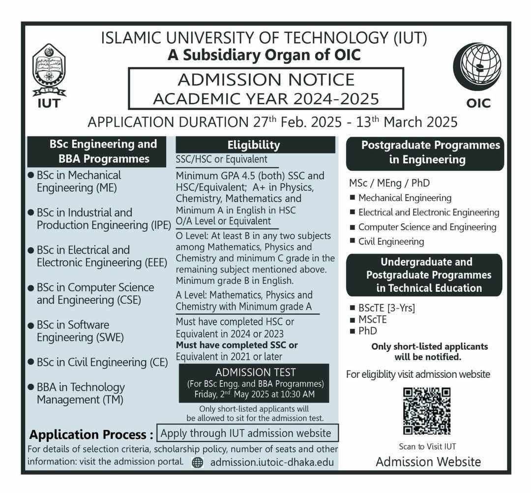 ওআইসি পরিচালিত ইসলামিক ইউনিভার্সিটি অফ টেকনোলজি (আইইউটি) ঢাকার অদূরে গাজীপুরে অবস্থিত একটি ইন্টারন্যাশনাল ইউনিভার্সিটি। সম্প্রতি আইইউটির ভর্তি পরীক্ষার সার্কুলার প্রকাশিত হয়েছে। এই পোস্টে আইইউটি অ্যাডমিশন টেস্টের বিস্তারিত তুলে ধরার চেষ্টা করবো।
