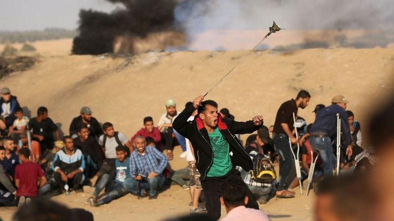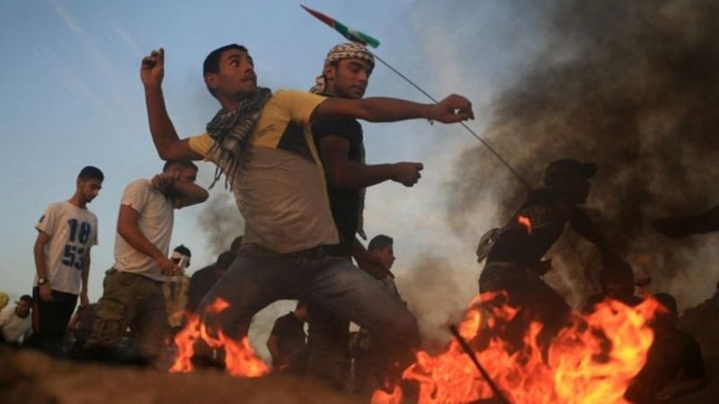 ইসরায়েলি হামলার বিরুদ্ধে পাথর ছুঁড়ে ফিলিস্তিনিদের লড়াই