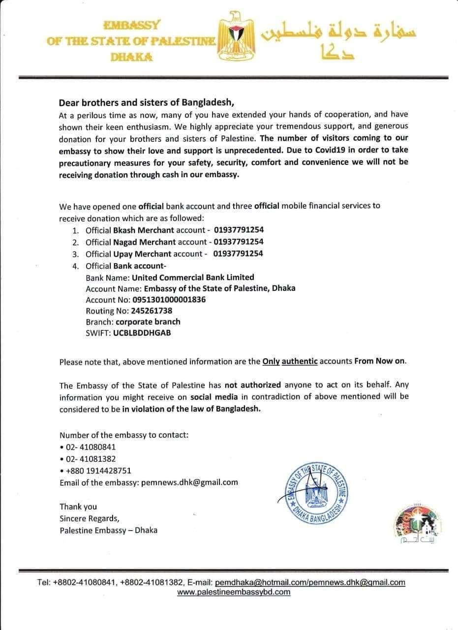 Embassy of the state of Palestine ,Dhaka,Bangladesh তাদের অফিসিয়াল ফেসবুক পেজ থেকে ডোনেশন গ্রহণ সংক্রান্ত অফিসিয়াল বিবৃতি দিয়েছে। নগদের সাথে বিকাশ এবং উপায় মার্চেন্ট একাউন্টও যুক্ত করা হয়েছে।