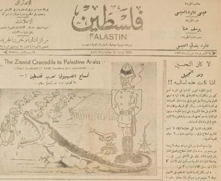 ১৯৩৬ সালের ১৮ জুন আরব খ্রিষ্টানদের মালিকানাধীন ফালাস্তান পত্রিকায় একটি কার্টুনসহ ছাপা হয়- ‘জায়নবাদীরা ফিলিস্তিনকে কুমিরের মত গিলে খাবে’।