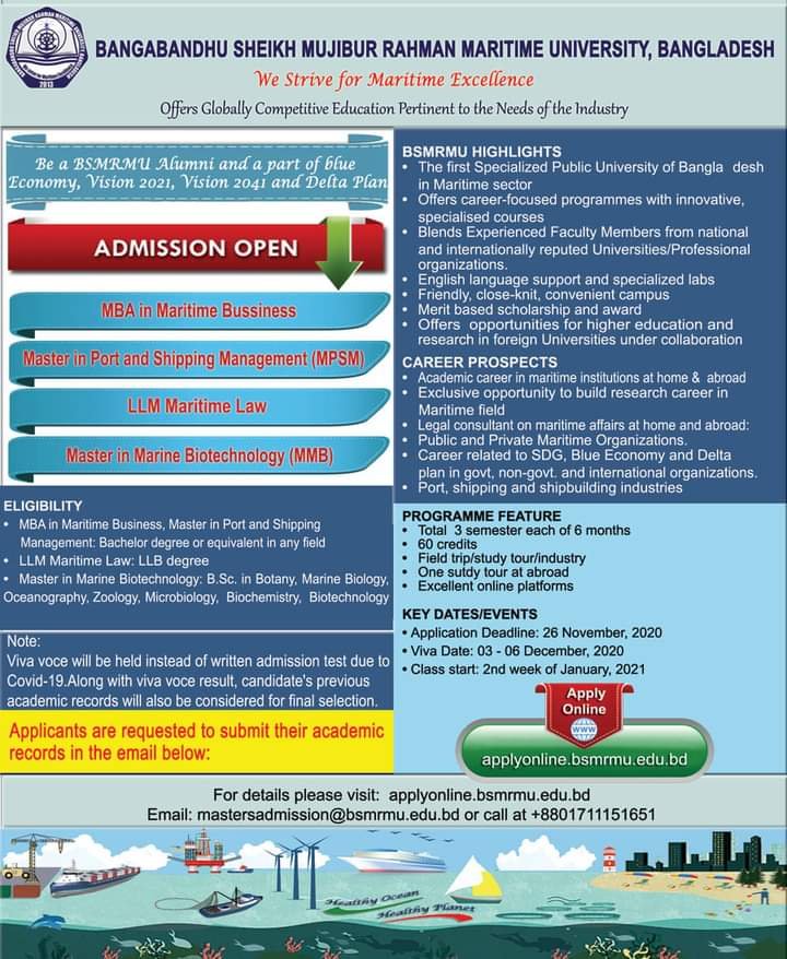 ২০২০-২১ সনের মাস্টার্স প্রোগ্রামের ভর্তি শুরু হচ্ছে বঙ্গবন্ধু শেখ মুজিবুর রহমান মেরিটাইম বিশ্ববিদ্যালয়ে। BSMRMU ২০২০-২১ সনের মাস্টার্স প্রোগ্রামের ভর্তি শুরু হচ্ছে বঙ্গবন্ধু শেখ মুজিবুর রহমান মেরিটাইম বিশ্ববিদ্যালয়ে।