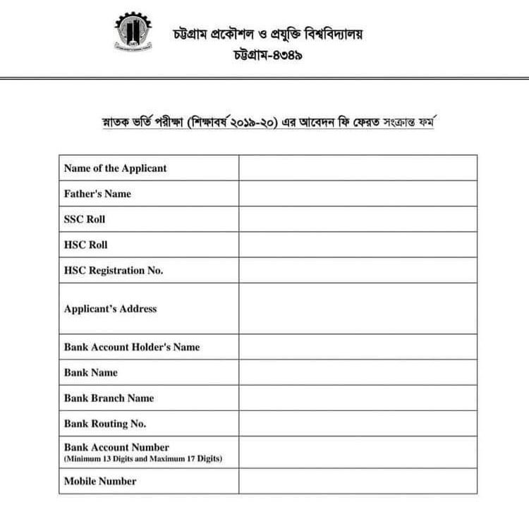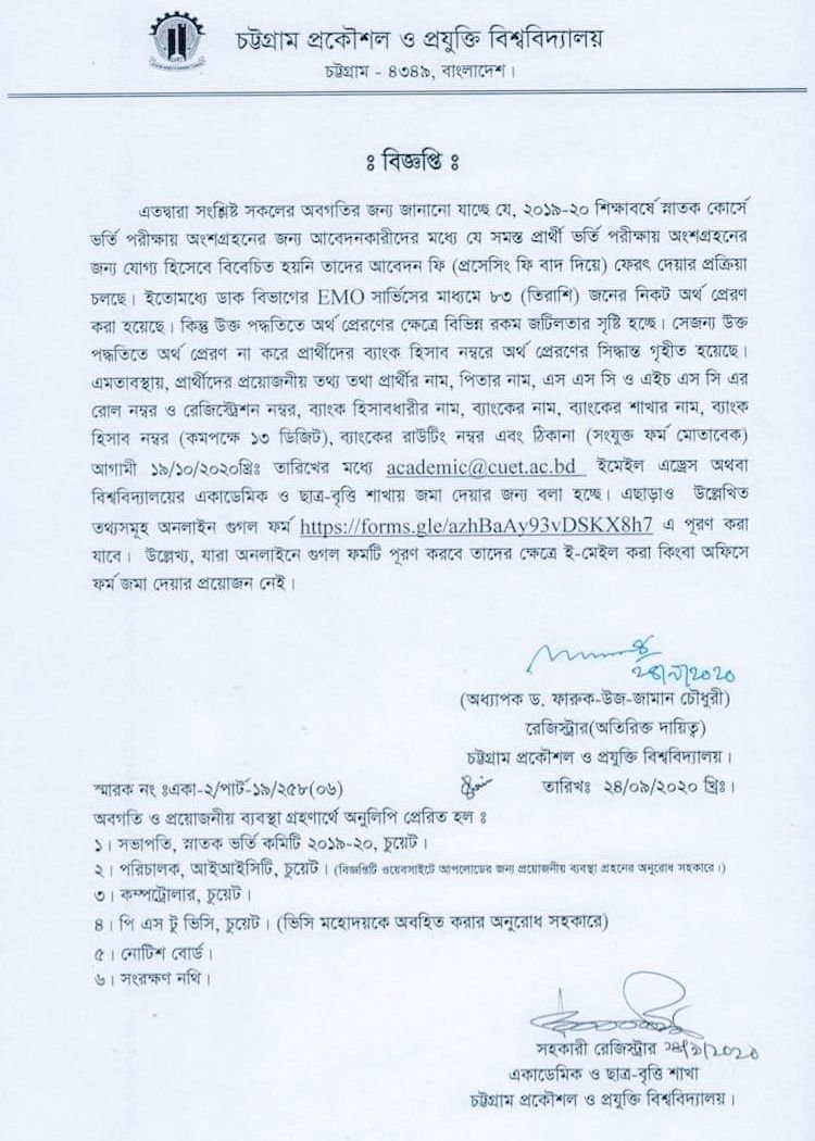 ২০১৯-২০ শিক্ষাবর্ষে ভর্তির আবেদন করে যেসকল আবেদনকারী ভর্তি পরীক্ষা দেয়ার প্রাথমিক লিস্টে জায়গা পায়নি, তাদের আবেদন ফি ফেরত দেয়ার সিদ্ধান্ত নিয়েছে চুয়েট কর্তৃপক্ষ। ইতিমধ্যে বেশ কয়েকজনকে ডাক যোগে টাকা ফেরত পাঠানোর চেষ্টা সফল না হওয়ায় এবার অনলাইনে ব্যাংক একাউন্ট নাম্বার জমা দেয়ার জন্য ২৪ সেপ্টেম্বর একটি নোটিশ প্রদান করা হয়েছে। ছবি সংযুক্ত।