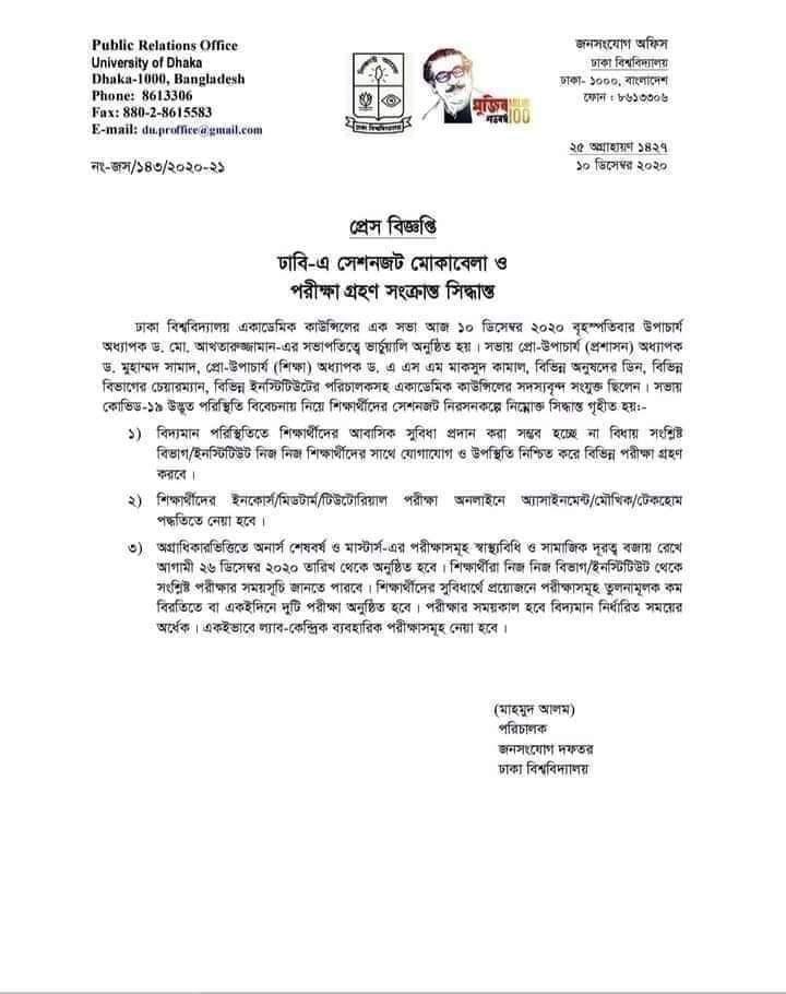 এ ছাড়া, আগামী ২৬ ডিসেম্বর থেকে অগ্রাধিকারভিত্তিতে অনার্স শেষ বর্ষ ও মাস্টার্সের পরীক্ষাগুলো স্বাস্থ্যবিধি ও সামাজিক দূরত্ব বজায় রেখে অনুষ্ঠিত হবে। শিক্ষার্থীরা নিজ নিজ বিভাগ বা ইনস্টিটিউট থেকে পরীক্ষার সময়সূচী জানতে পারবেন।