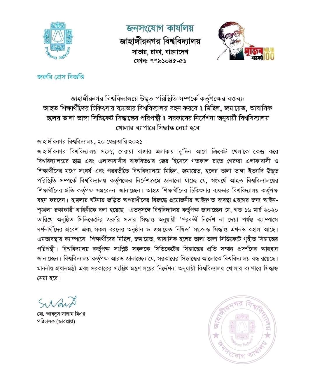 গেরুয়া এলাকাবাসীর আক্রমণে আহত জাহাঙ্গীরনগর বিশ্ববিদ্যালয়ের শিক্ষার্থীদের চিকিৎসা খরচ বহন করার সিদ্ধান্তসহ কয়েকটি নির্দেশনা নিয়ে জরুরি প্রেস বিজ্ঞপ্তি প্রকাশ করেছে জাহাঙ্গীরনগর বিশ্ববিদ্যালয় কর্তৃপক্ষ।