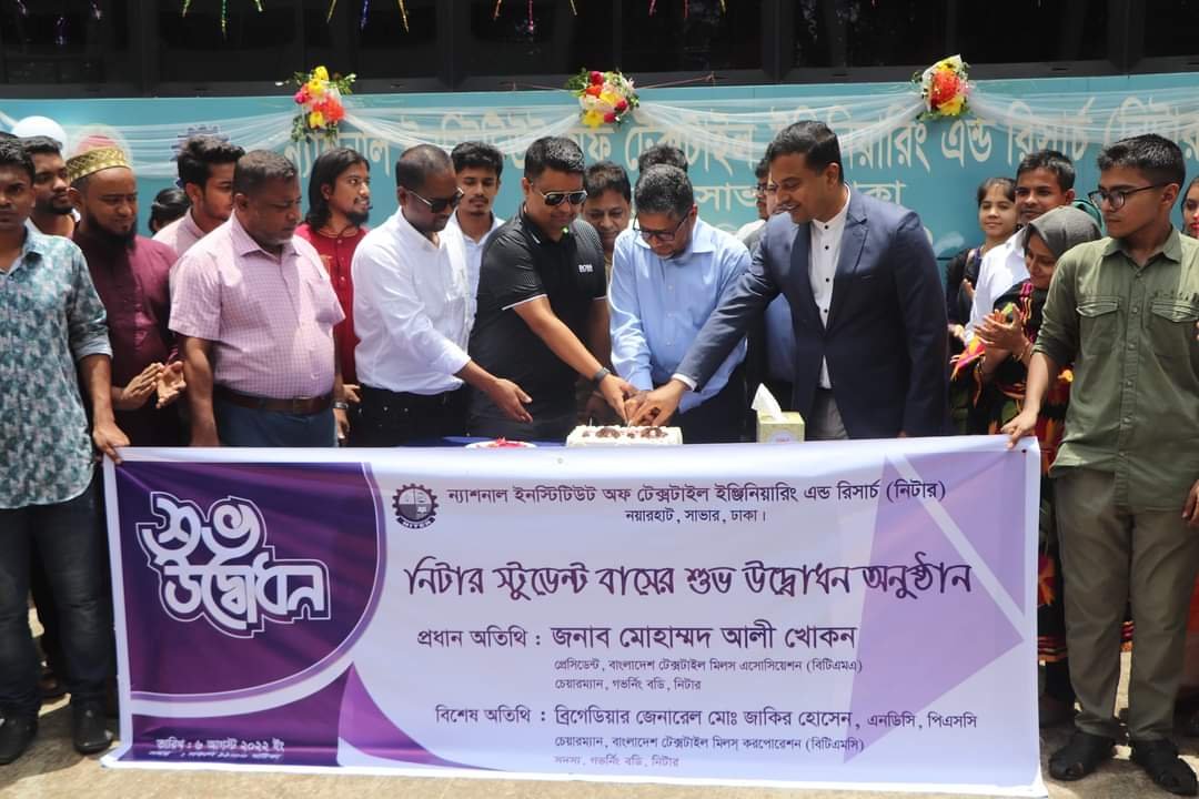 ঢাকা বিশ্ববিদ্যালয়ের ইঞ্জিনিয়ারিং এন্ড টেকনোলজি অনুষদের শিক্ষা ও টেক্সটাইল গবেষণা শিক্ষাপ্রতিষ্ঠান ন্যাশনাল ইনস্টিটিউট অফ টেক্সটাইল ইঞ্জিনিয়ারিং এন্ড রিসার্চ (নিটার) এর গভর্নিং বডির চেয়ারম্যান ও বাংলাদেশ টেক্সটাইল মিলস্ এসোসিয়েশন (বিটিএমএ) সভাপতি জনাব মোহাম্মদ আলী খোকন রঙিন ফিতা ও কেক কেটে নিটারের শিক্ষার্থী বাস শুভ উদ্বোধন ঘোষণা করেন।