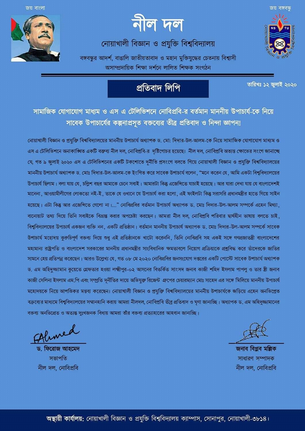 তিনি আরও বলেন, ইসলাম ধর্ম নিয়ে কটূক্তি বিষয়ক সামাজিক যোগাযোগ মাধ্যমের নোবিপ্রবির দুই শিক্ষার্থীর ব্যাপারটা নোবিপ্রবি প্রশাসনের দৃষ্টি গোছর হয়েছে। বিষয়টি নিয়ে আমি মাননীয় উপাচার্য ও ট্রেজারার স্যারের সাথে কথা বলেছি। প্রশাসন শিগগিরই এব্যাপারটি যাচাই বাচাই করে বিশ্ববিদ্যালয়ের আইন অনুযায়ী করণীয় নির্ধারণ করবে বলে আমাকে জানানো হয়েছে। এ ব্যাপারে কাউকে উস্কানিমূলক বক্তব্য না দেয়ার জন্যে অনুরোধ করছি। আমরা কেউই বাংলাদেশ সরকারের আইনের উর্ধ্বে নই।
