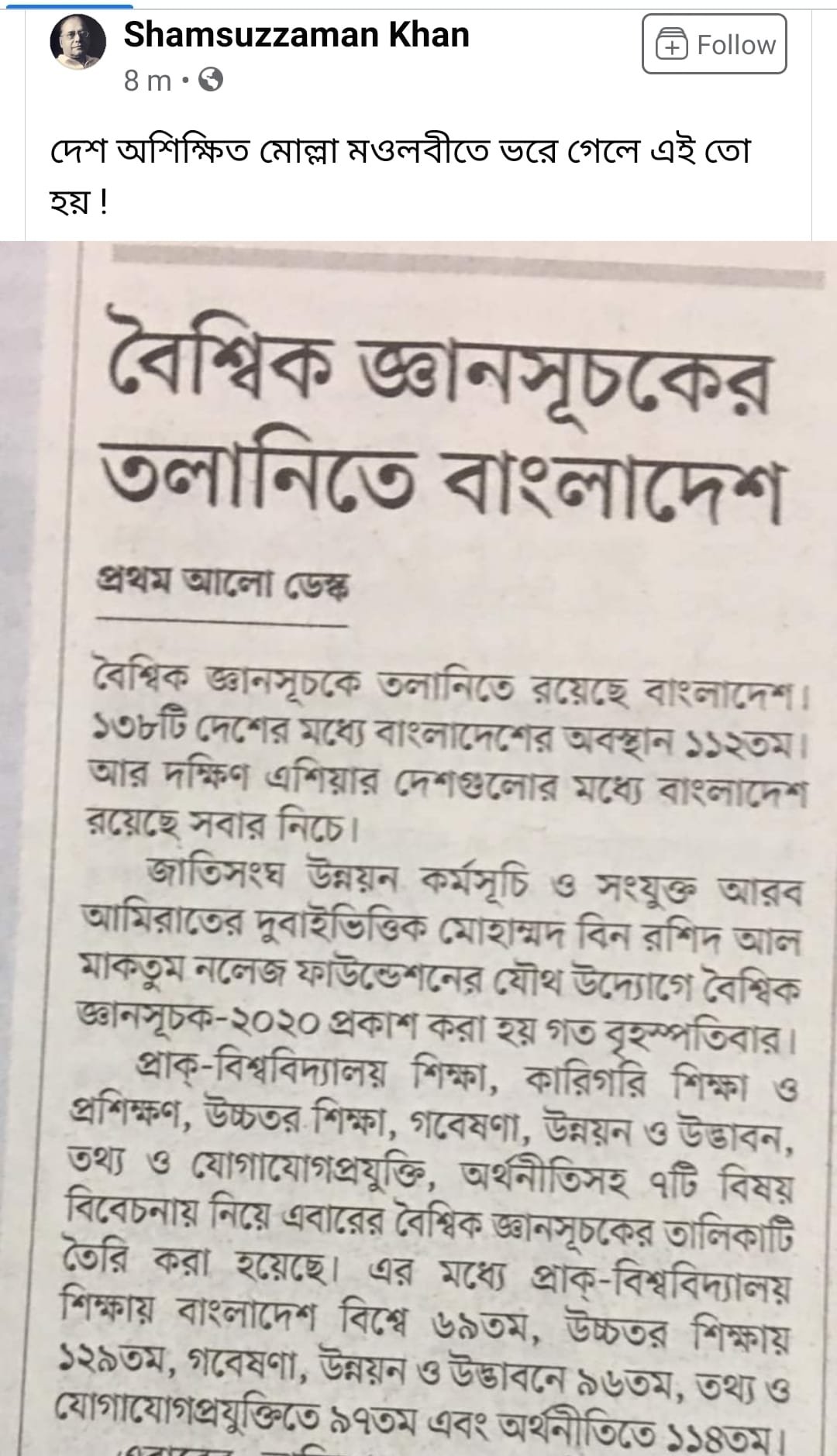 বৈশ্বিক জ্ঞানসূচকের তলানিতে বাংলাদেশ শীর্ষক খবরের বিষয়ে মন্তব্যে বাংলা একাডেমির সভাপতি শামসুজ্জামান খান একথা লিখেছেন।