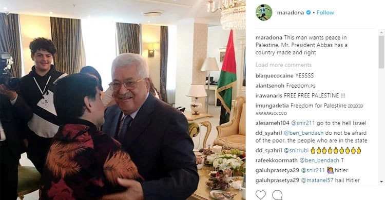 ফিলিস্তিনি প্রেসিডেন্ট মাহমুদ আব্বাসের সঙ্গে একটি ছবি পোস্ট করে ইনস্টাগ্রামে নিজের পেজে ম্যারাডোনা লিখেছিলেন, ‘এই লোকটি ফিলিস্তিনে চায় শান্তি প্রতিষ্ঠা করতে। মিস্টার আব্বাস একটি সঠিক রাষ্ট্রই প্রতিষ্ঠা করেছেন।’
