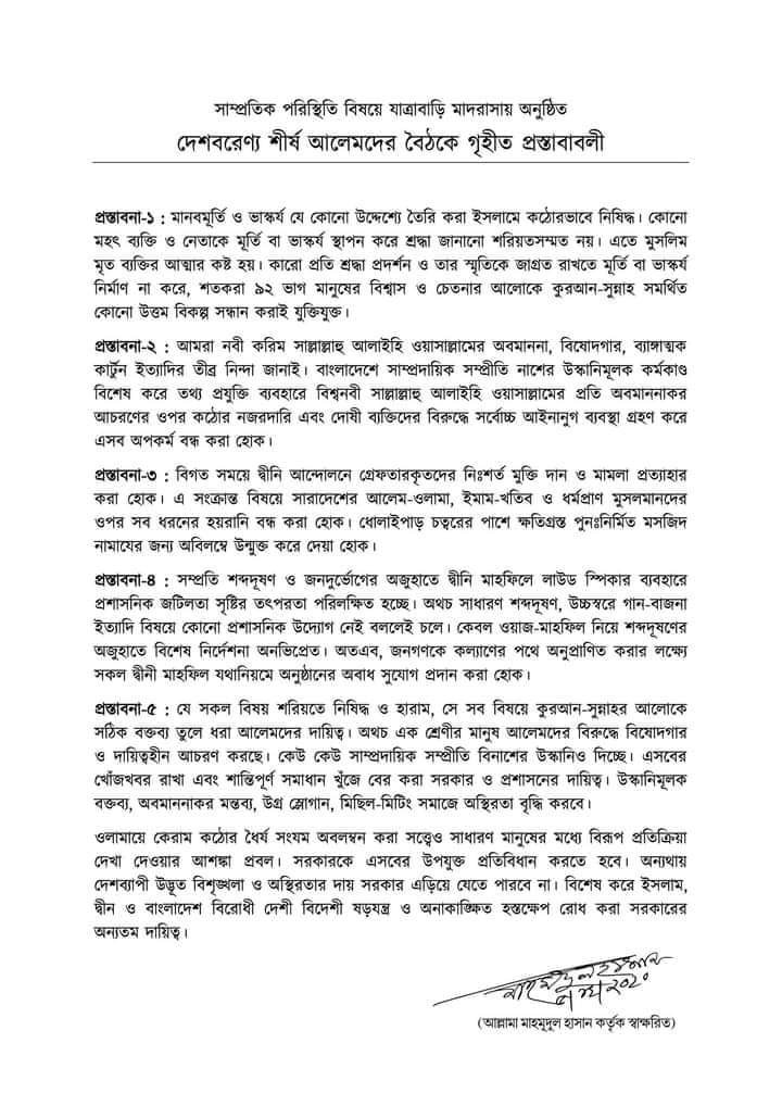 যাত্রাবাড়ি মাদ্রাসায় বৈঠকের পর আলেমদের দেয়া এক বিবৃতিতে বলা হয়েছে, “মানবমূর্তি ও ভাস্কর্য যে কোন উদ্দেশ্যে তৈরি করা ইসলামে কঠোরভাবে নিষিদ্ধ।”