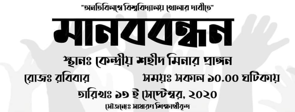 আগামী ১৩ই সেপ্টেম্বর ঢাকা কেন্দ্রীয় শহীদ মিনারে সকাল ১০ টায় স্বাস্থ্যবিধি মেনে বিশ্ববিদ্যালয় খুলে দেয়ার জন্য মানববন্ধনের আয়োজন করতে যাচ্ছে একদল শিক্ষার্থী।